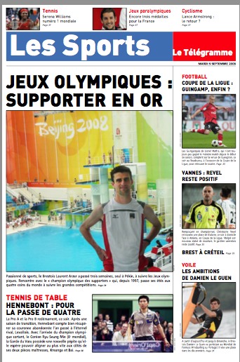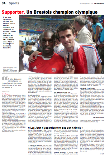 A mon retour des jeux olympiques de Pékin et sans doute, grâce à la diffusion de mes carnets de voyage sur le site du Stade Brestois athlé, relayés par Vincent (toujours lui et encore merci), Yves-Marie Théréné, du journal Le Télégramme de Brest me contacte pour faire un article sur ma virée chinoise. Après l’entretien, il a une petite idée de l’article qu’il veut faire mais ne me dit rien. Je m’attends à quelques lignes dans la rubrique sport, ce qui m’aurait déjà flatté. La veille de la parution, il m’envoie un SMS: « achète le journal demain, je t’ai soigné. » En effet..