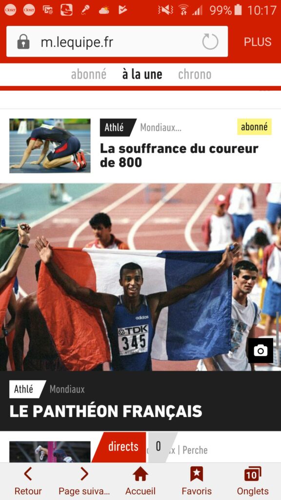 Pas de Londres 2017 dans le stade pour moi. Je suis l’événement mondial d’athlétisme dans mon canapé. Les Français Bosse, Mayer et Diniz triomphent. Et l’Equipe.fr nous fait un récapitulatif de toutes les médailles d’or françaises depuis la création des championnats en 1987. 20 ans après, la photo de 1997 resurgit..
